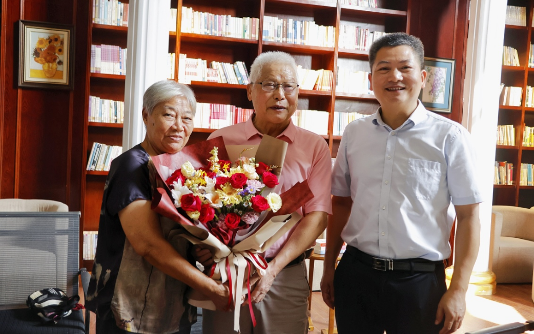 伍复康与黄健保老师夫妇亲切交谈,细致询问黄老师的饮食起居和身体状况,对他多年来扎根讲台、潜心育人所作出的贡献表示衷心感谢,并希望老两口保重身体,持续关注学校各项事业发展,多提宝贵意见。黄健保老师对学校的关怀表示感谢,他深情回忆了在校执教悠悠岁月中的点滴往事,并为学校近年来取得的办学成就感到自豪。