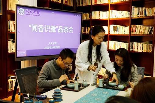 随后,我院王梅珊博士为在场人员带来一堂精彩的品茶艺术分享课。她从茶史溯源、茶叶品类辨析,逐步延伸至冲泡技巧与品鉴方法,引导师生校友沉浸式感受茶汤的色、香、味、形。众人细嗅茶香、慢品回甘,在交流互动中既增进了茶文化认知,更深化了彼此情谊。