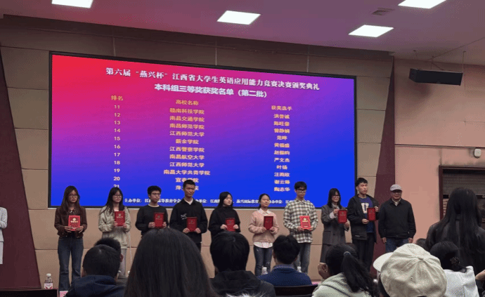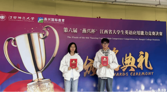 2025年10月25-26日,第六届“燕兴杯”江西省大学生英语应用能力大赛在江西师范大学举行,来自全省近200名英语本科生进行了激烈的角逐,我校朱静怡、黄福盛同学脱颖而出,分别获得二等奖和三等奖,充分展示了我校学子的实践创新实力。