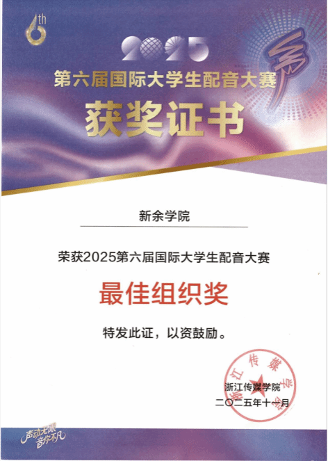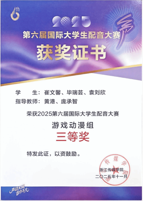由中国高等院校影视学会指导,浙江传媒学院与搜狐视频联合主办,浙江传媒学院播音主持艺术学院、绍兴金柯桥鉴湖控股集团等单位承办的第六届国际大学生配音大赛,于2025年10月30日至11月2日在浙江省绍兴市柯桥体育馆成功举办。