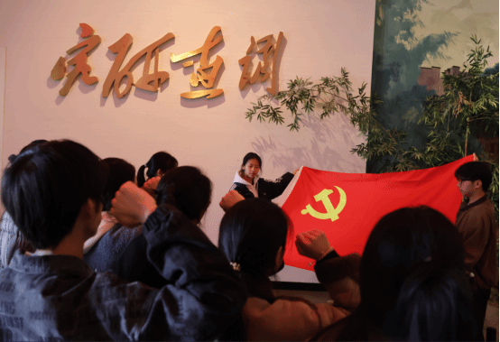 参观尾声,全体党员在宣誓墙前庄严肃立,高举右拳重温入党誓词,铿锵誓言既是对革命先辈的致敬,更是对践行 “六个坚持”、永葆党员本色的庄严承诺。