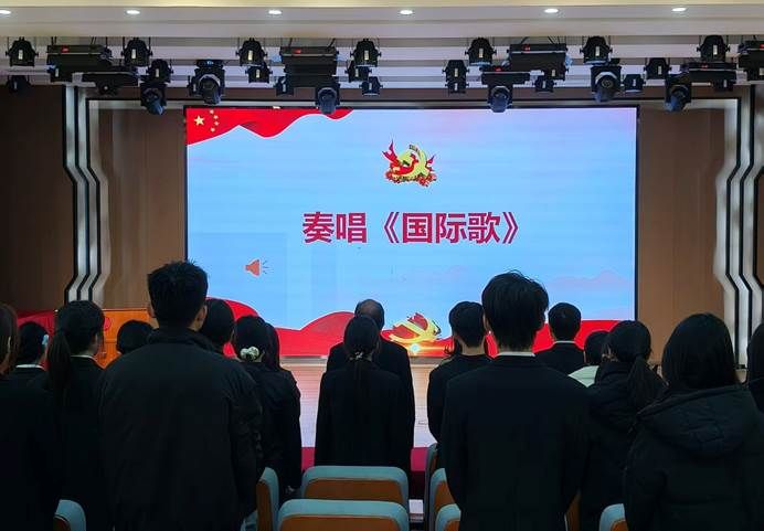 大会在庄严的《国际歌》声中拉开帷幕。全体党员面向党旗肃立,激昂嘹亮的歌声回荡在会场每一个角落,现场气氛庄重而热烈。