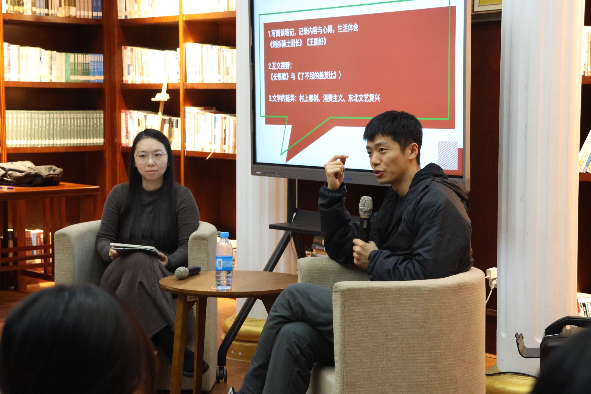 本场活动采用轻松开放的访谈形式,围绕“如何走进一本书、如何让阅读滋养人生”展开。万兴博士从自己的学术起点——德语学习谈起,逐步延伸到比较文学与电影研究的跨界经历,分享了从语言训练到思想建构的学术路径。他从阅读兴趣的培养、经典文本的深度进入、日常阅读习惯的积累等多个层面,结合具体的研究案例与个人体悟,系统阐述了人文阅读如何塑造思维、沉淀素养、回应生命困惑。